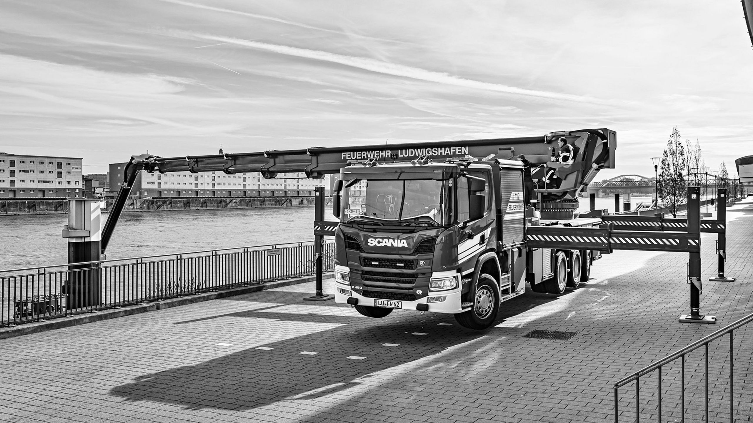 Thanks to its powerful N80 pump, a B60 hydraulic platform like the one used in Ludwigshafen allows for a flow rate of 3,300 liters (872 US gallons) per minute even at the maximum working height of 60 meters (197 feet). This capacity is immensely important in fighting industrial fires—and was one of the pivotal criteria for the Ludwigshafen fire department.