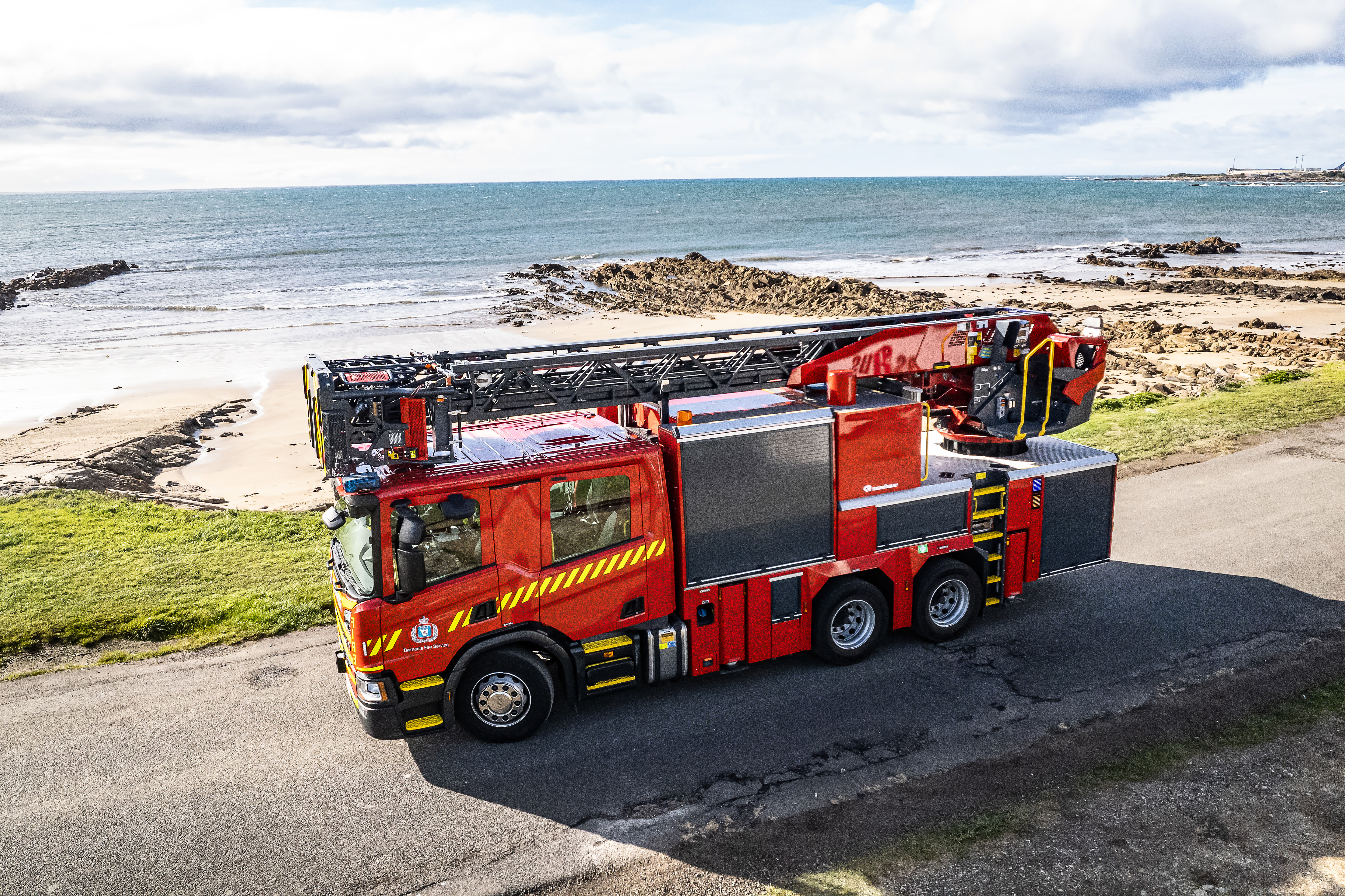 Weil es in Burnie pro Schicht nur vier Feuerwehrleute gibt, möchte man mit diesem Personalsockel am Einsatzort möglichst viel ausrichten. Aus diesem Grund wurde bei Rosenbauer ein echter Allrounder bestellt: Eine Drehleiter vom Typ L24C FA, die auch löschen kann und zudem über technisches Rettungsgerät verfügt. Die Australierinnen und Australier nennen so ein Universalfahrzeug, mit dem man quasi perfekt für den First Response-Einsatz gerüstet ist, ‚Combined Aerial Pumper Appliance‘ oder kurz: CAPA.