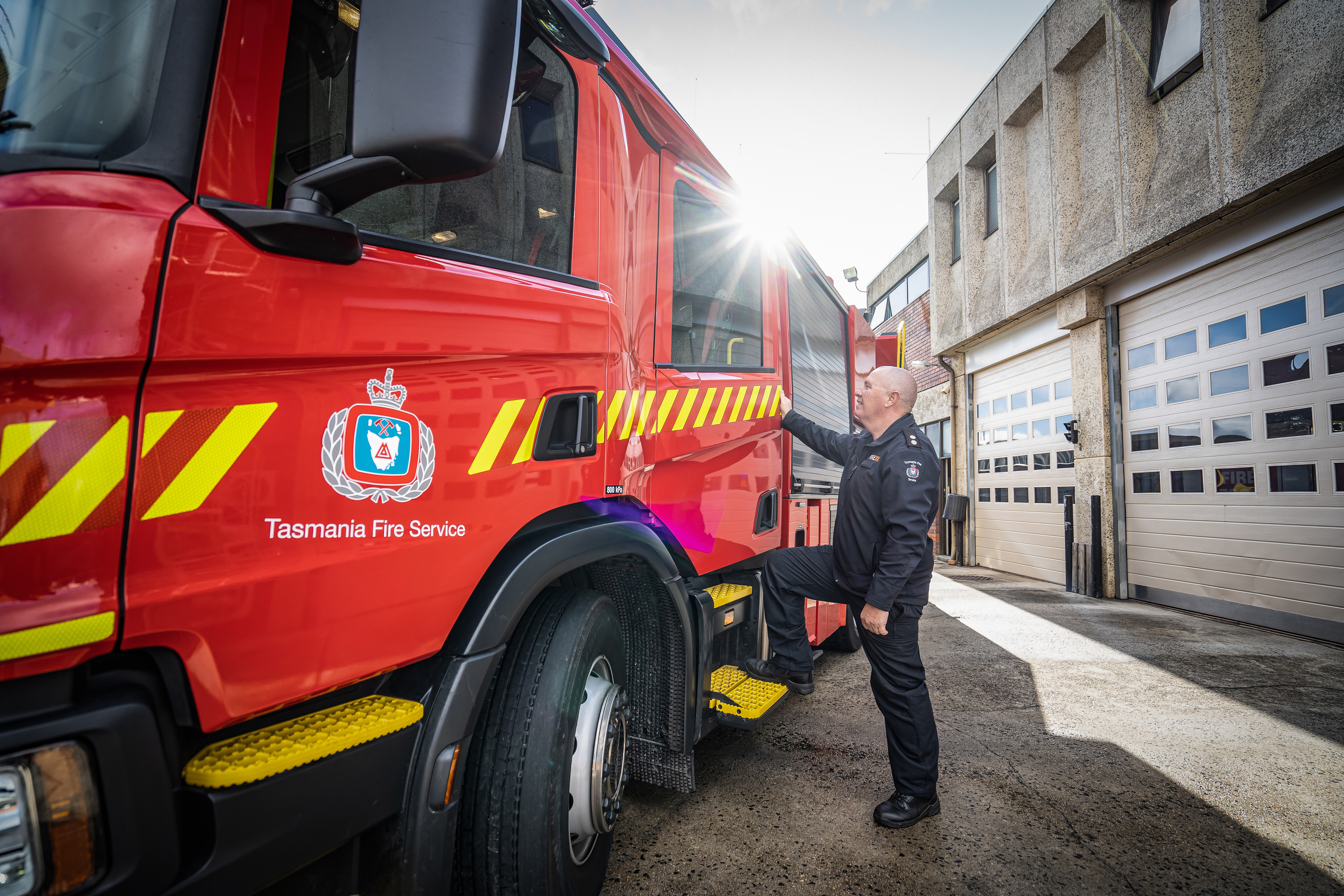 Anders als in der Hauptstadt Hobart mit ihren mehr als 200.000 Einwohnerinnen und Einwohnern und vielen Hochhäusern, reichen die 24 Meter Arbeitshöhe völlig aus – zwei Rosenbauer Drehleitern mit 36 Metern stehen ja auch noch in der Garage. „Die Anforderungen waren, gut durch enge Straßen zu kommen und Häuser mit maximal vier Stockwerken anzufahren“, erklärt Steven und unterstreicht noch einmal den besonderen Nutzen der Kombination aus Löschen und Retten: „Alle vier Feuerwehrleute passen in das Mehrzweckfahrzeug und können am Einsatzort sofort etwas ausrichten, egal was dort auf sie wartet.“ Um diesen Vorteil anschaulicher zu machen: In Launceston, der zweitgrößten Stadt Tasmaniens, wo Steven üblicherweise arbeitet, sind ständig drei Mannschaften im Dienst. In einem Brandfall können diese einfach mit mehreren unterschiedlichen Spezialfahrzeugen ausrücken. Mit weniger Personalstärke wie in Burnie müssen Fahrzeugeigenschaften eben gebündelt werden.