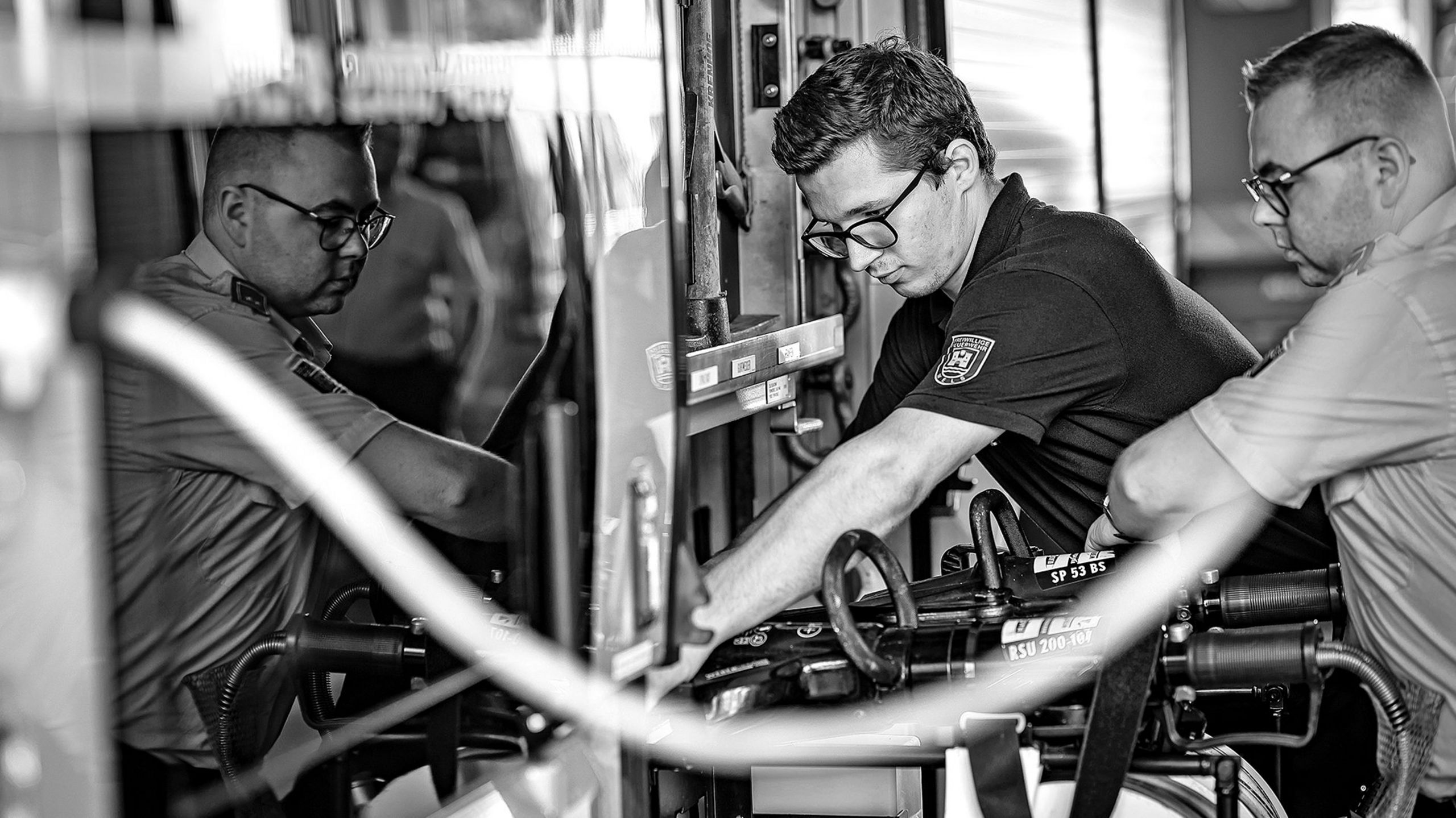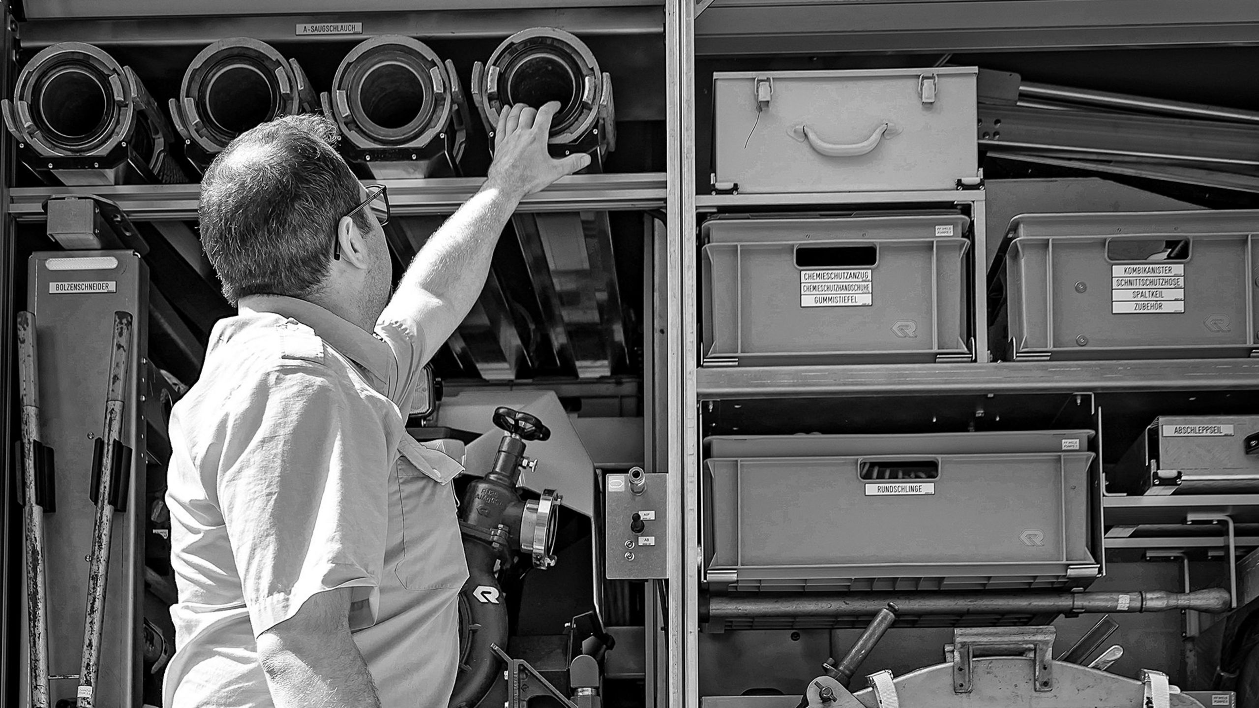 Michael, wie Siegfried gelernter KFZ-Techniker, ist ein ganzes Stückchen kleiner als Roland. Nachdem er die elektrischen Rollläden des Einsatzfahrzeugs blitzschnell nach oben fahren lässt – was übrigens auch zentral und automatisch über den Einsatzstellentaster funktioniert –, demonstriert er, wo die weiteren Stärken des CT Frame Aufbaus liegen: Die Laderäume reichen nach unten bis auf das Niveau der Radachsen und selbst die obersten Fächer sind ohne Auftrittsklappen oder Ähnliches gut zu erreichen.
