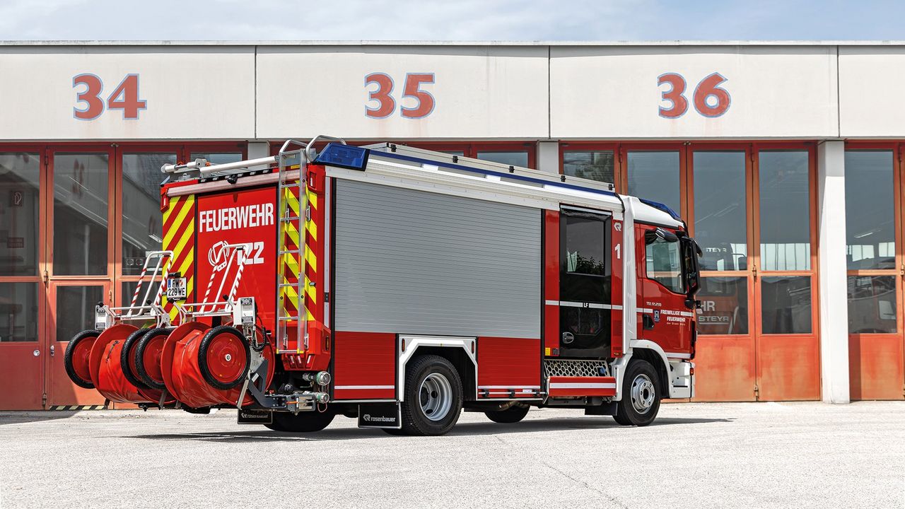 Das 12-Tonnen-Fahrgestell mit Heckantrieb – Allrad wäre im Stadtgebiet überflüssig – wurde dann von Rosenbauer so aufgebaut, dass es für fast alle Eventualitäten gerüstet ist. An Bord ist eine N35 Pumpe, die von einem 1.200 Liter großen Wassertank versorgt wird, Schaummittel kann ebenfalls zugemischt werden. Zusätzlich gibt es aber auch eine Tragkraftspritze FOX. Sie stellt sicher, angesaugtes Wasser „auch über weite Entfernung befördern zu können“, wie Siegfried ergänzt. Am Heck aufgeprotzt sind zwei Ein-Mann-Haspeln, die in Wels, wenn auch in Österreich eher unüblich, Tradition haben und für gutes Schlauchhandling sorgen. Auf dem Dach verstaut sind vier Steckleitern und die Kabine bietet Platz für die fahrzeugführende Person und acht weitere Einsatzkräfte, die noch dazu mit Atemschutz ausgerüstet sein können. Eine integrierte Nah- und Fernumfeldbeleuchtung macht zudem einen Lichtmast überflüssig. Doch es gibt noch mehr…