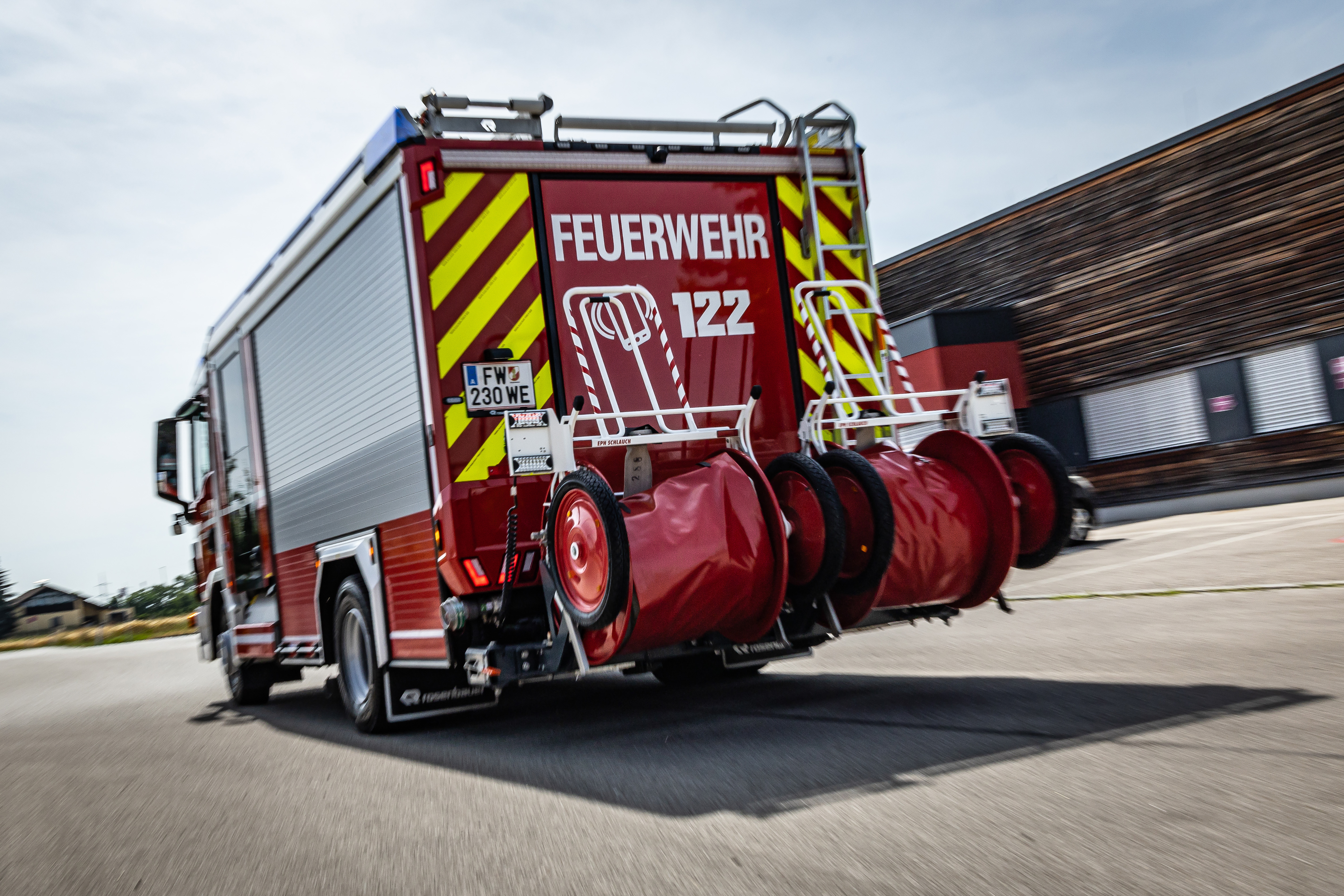Das 12-Tonnen-Fahrgestell mit Heckantrieb – Allrad wäre im Stadtgebiet überflüssig – wurde dann von Rosenbauer so aufgebaut, dass es für fast alle Eventualitäten gerüstet ist. An Bord ist eine N35 Pumpe, die von einem 1.200 Liter großen Wassertank versorgt wird, Schaummittel kann ebenfalls zugemischt werden. Zusätzlich gibt es aber auch eine Tragkraftspritze FOX. Sie stellt sicher, angesaugtes Wasser „auch über weite Entfernung befördern zu können“, wie Siegfried ergänzt. Am Heck aufgeprotzt sind zwei Ein-Mann-Haspeln, die in Wels, wenn auch in Österreich eher unüblich, Tradition haben und für gutes Schlauchhandling sorgen. Auf dem Dach verstaut sind vier Steckleitern und die Kabine bietet Platz für die fahrzeugführende Person und acht weitere Einsatzkräfte, die noch dazu mit Atemschutz ausgerüstet sein können. Eine integrierte Nah- und Fernumfeldbeleuchtung macht zudem einen Lichtmast überflüssig. Doch es gibt noch mehr…