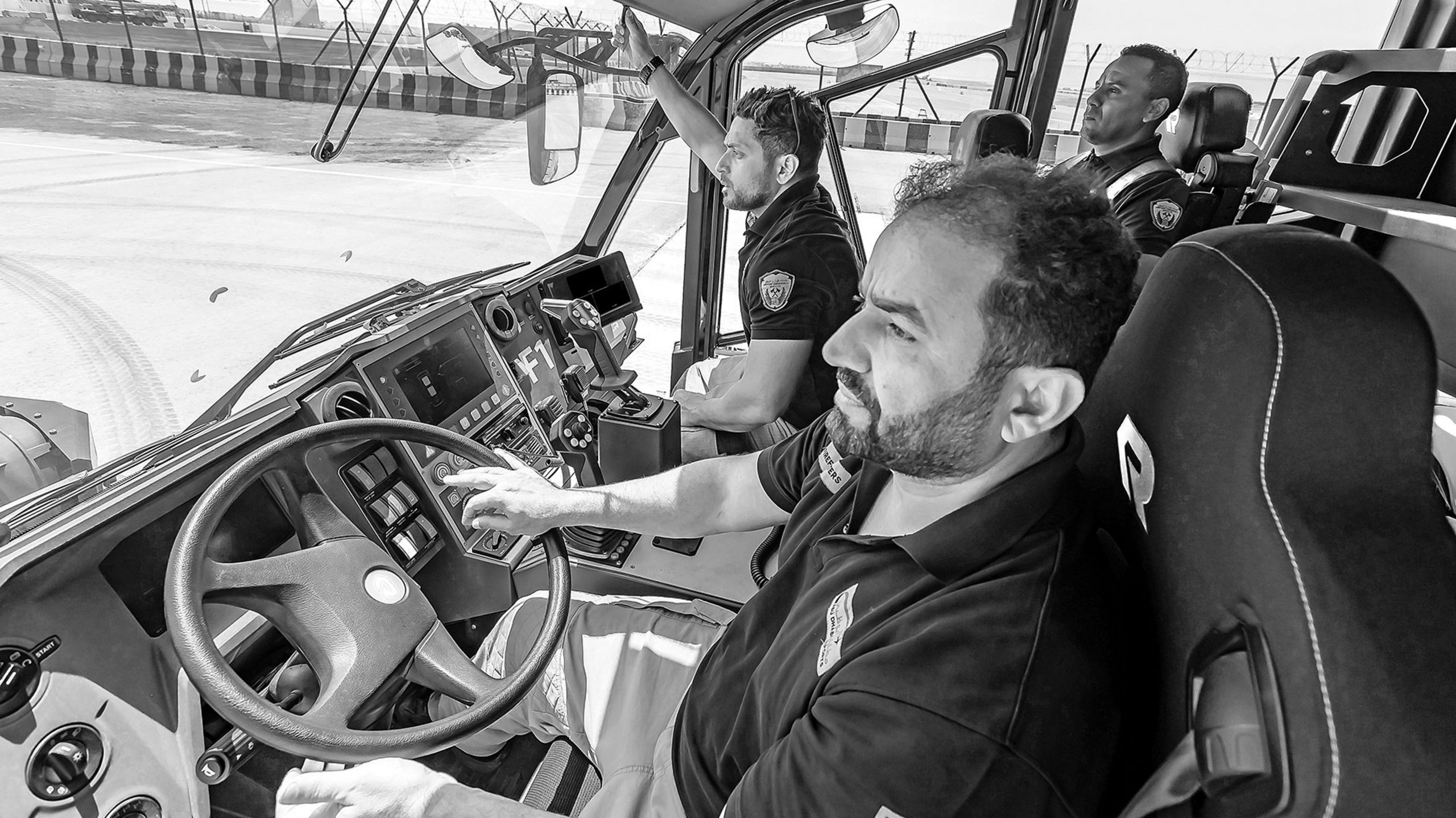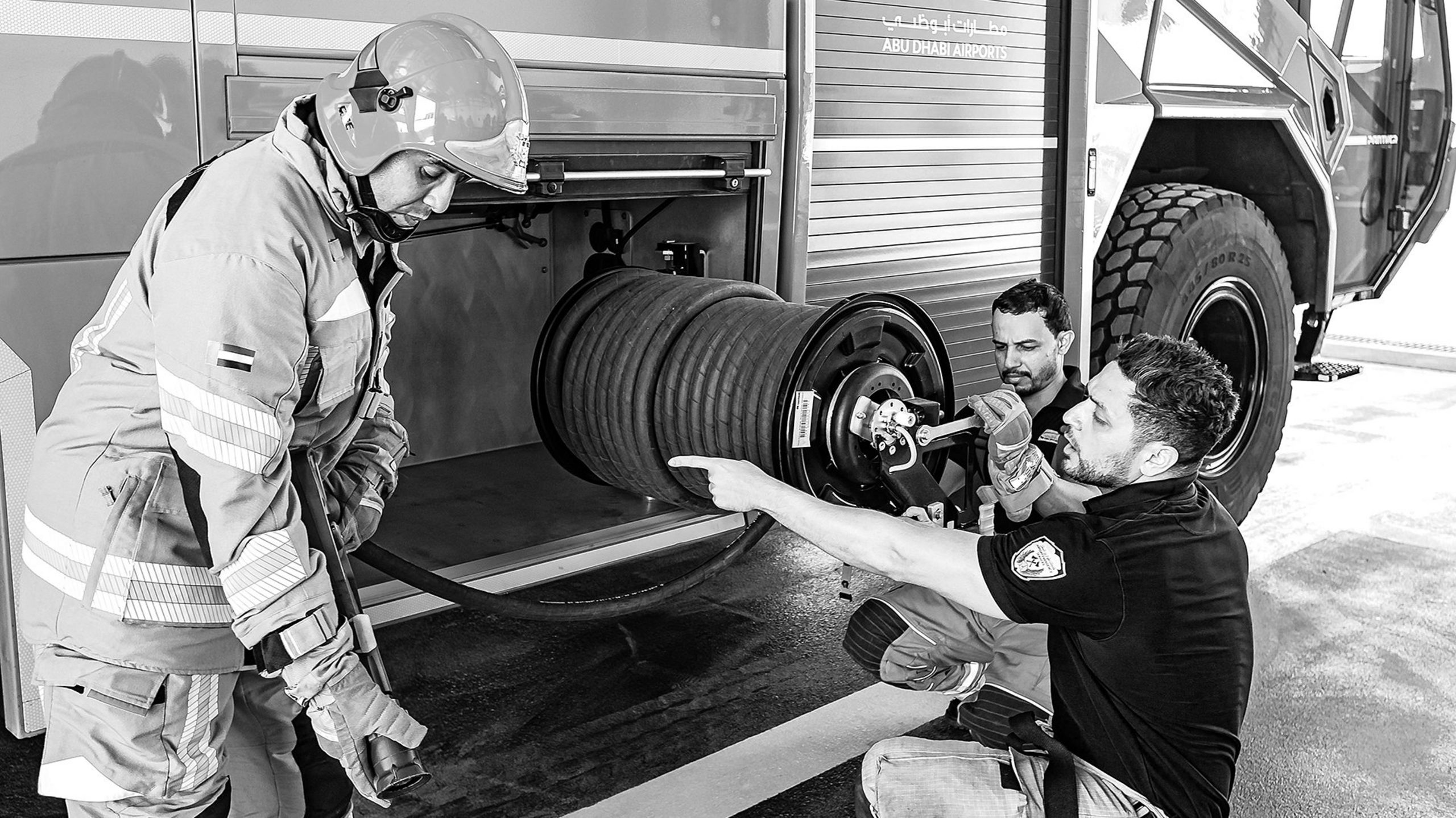 Löschen ist außerdem nicht nur mit Wasser, Schaum und Pulver möglich – selbst eine CO2-Löschanlage ist an Bord. Es wird also deutlich: An den Abu Dhabi Airports überlässt man nichts dem Zufall. Oder in Johns Worten: „Unser oberstes Ziel ist es, nur topmoderne Rettungs- und Brandbekämpfungsausrüstung zu haben.“