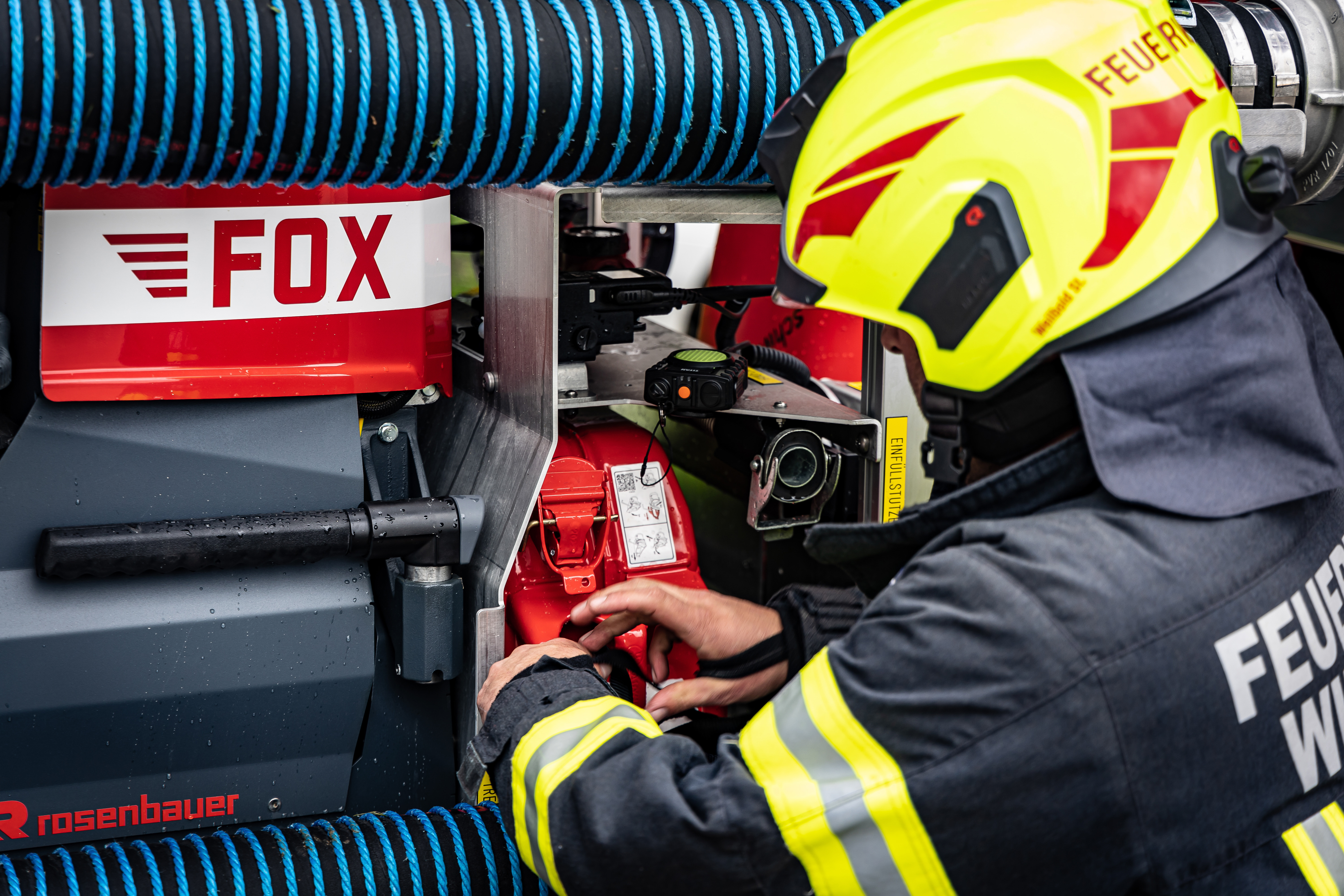 Unlike when Karl started out—“back then we had to assemble one of the smaller fire-fighting vehicles ourselves”—the Wildenau Fire Department today has state-of-the-art equipment. Now, they rely exclusively on Rosenbauer products when it comes to personal protective equipment. And there’s a ten-year-old Rosenbauer rescue pumper, a command vehicle, and a crew truck in the garage. Only recently did the fleet get expanded by a Rosenbauer AT, a high-performance fire apparatus. This one-of-a-kind vehicle is primarily built to ensure water delivery over long distances. With its total weight of fourteen tons, Wildenau’s Rosenbauer AT is perfectly suited to transport 1,000-meter (3 280 feet) type B firehoses. But not only that; the AT is also equipped with a Rosenbauer FOX portable pump. Moreover, the vehicle houses equipment for simple technical assistance as well as power generators.