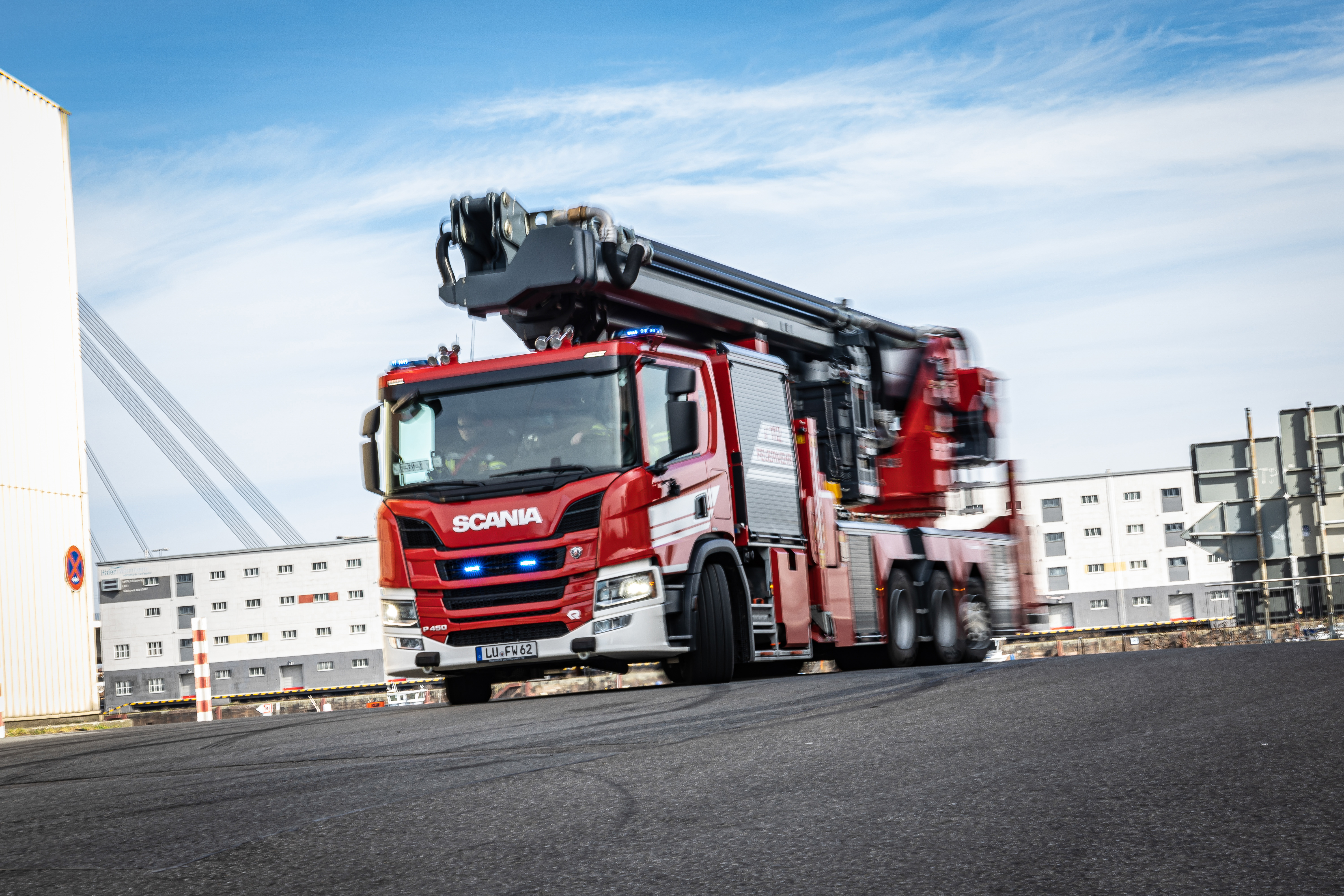 With the four aforementioned turntable ladders, the hydraulic platform in excellent company. But that’s not all! The Ludwigshafen fire department has many other Rosenbauer vehicles, for instance three standard fire trucks and three dry-powder tenders, each equipped with one 450 kilogram (992 pounds) dry-powder extinguisher, and one equipment vehicle.